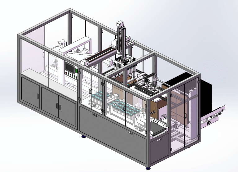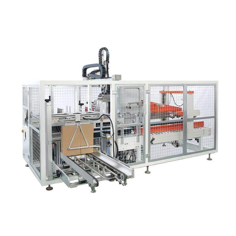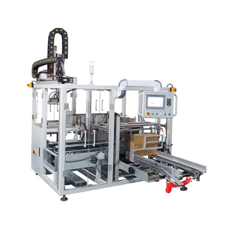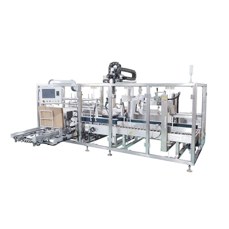 This case packing line performs case erector, case packer, and case sealer, making it suitable for large-scale production of pharmaceutical and daily chemical products. The equipment boasts a stable production efficiency of 1-5 cartons per minute. Each station features features such as missing carton detection, incoming product detection, overload protection, and carton position detection, enabling fully automated, unmanned packaging operations.